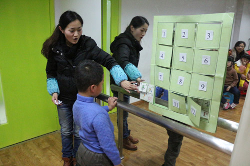 ? ? ? ?春雨老師則選擇了翻數字牌的游戲,只要能認出數字背后的漢字,就能得到卡片背后標明的小驚喜:小禮物、小貼畫、與好朋友的擁抱、親吻媽媽,你希望得到哪個呢?